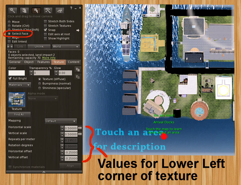 In general, lower Scale values enlarge the image, and the offset values shift the texture left/right and up/down.